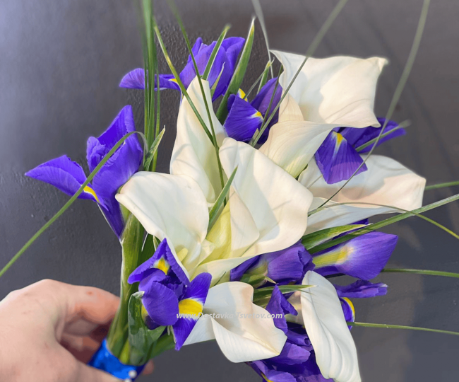 7 white calla lilies, 8 irises, 0.2 bergrass