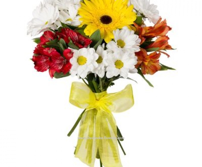 1 gerbera, 3 bush chrysanthemums, 3 alstroemeria, 0.5 salal