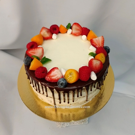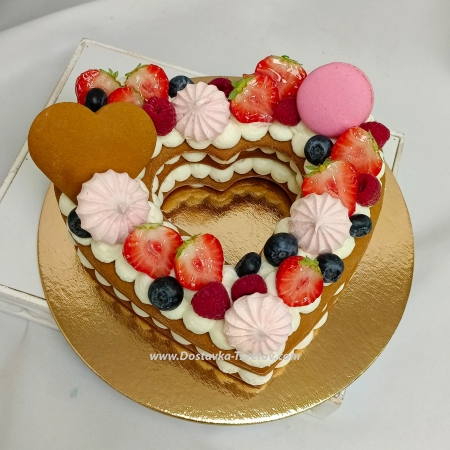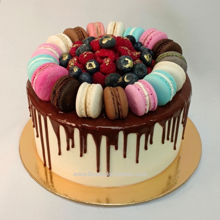 The composition includes a delicate vanilla sponge cake soaked in syrup, light vanilla cream based on sour cream, with the addition of pickled peaches. Decor of fresh juicy berries. Berries on the cake may vary depending on the season. The inscription on the cake can be changed (write your text in the comments). Weight of the cake - 2 kg. Order 3-4 days before the delivery date.